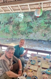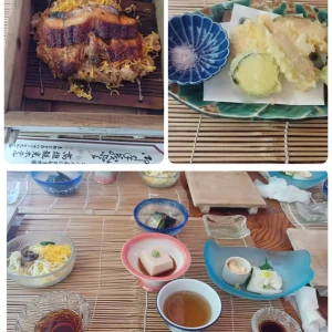 ホテルに設えた川床で鮎や鰻のせいろむし等頂きました。