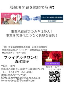 未分類 事業承継のアトツキさんを婚活で解決‼️ 2025年5月3日 2025年5月3日 akari-tomoko Facebook postはてブLINEPocketFeedly アトツギさんの婚活支援専門仲人『ブライダルサロン灯』の森本知子です。 事業承継結婚®アドバイザー資格取得 私たちは、個人のしあわせと事業承継の成功の両方を叶える 婚活支援を、全国の専門仲人で展開しています 日本経済の底力である家業の持続的発展を 仲人がご子息・ご息女の結婚でご縁を繋ぎます。 全国から集まった、志ある仲人の連携でアトツギ問題を解決します。 Facebook postはてブLINEPocketFeedly