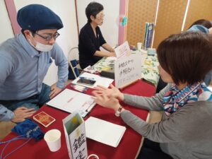 メメント・モリの伝道師 岩井先生のセッションをされている横で私は手相王子こと加藤景太氏に手相占いとカード占いをして頂きました。