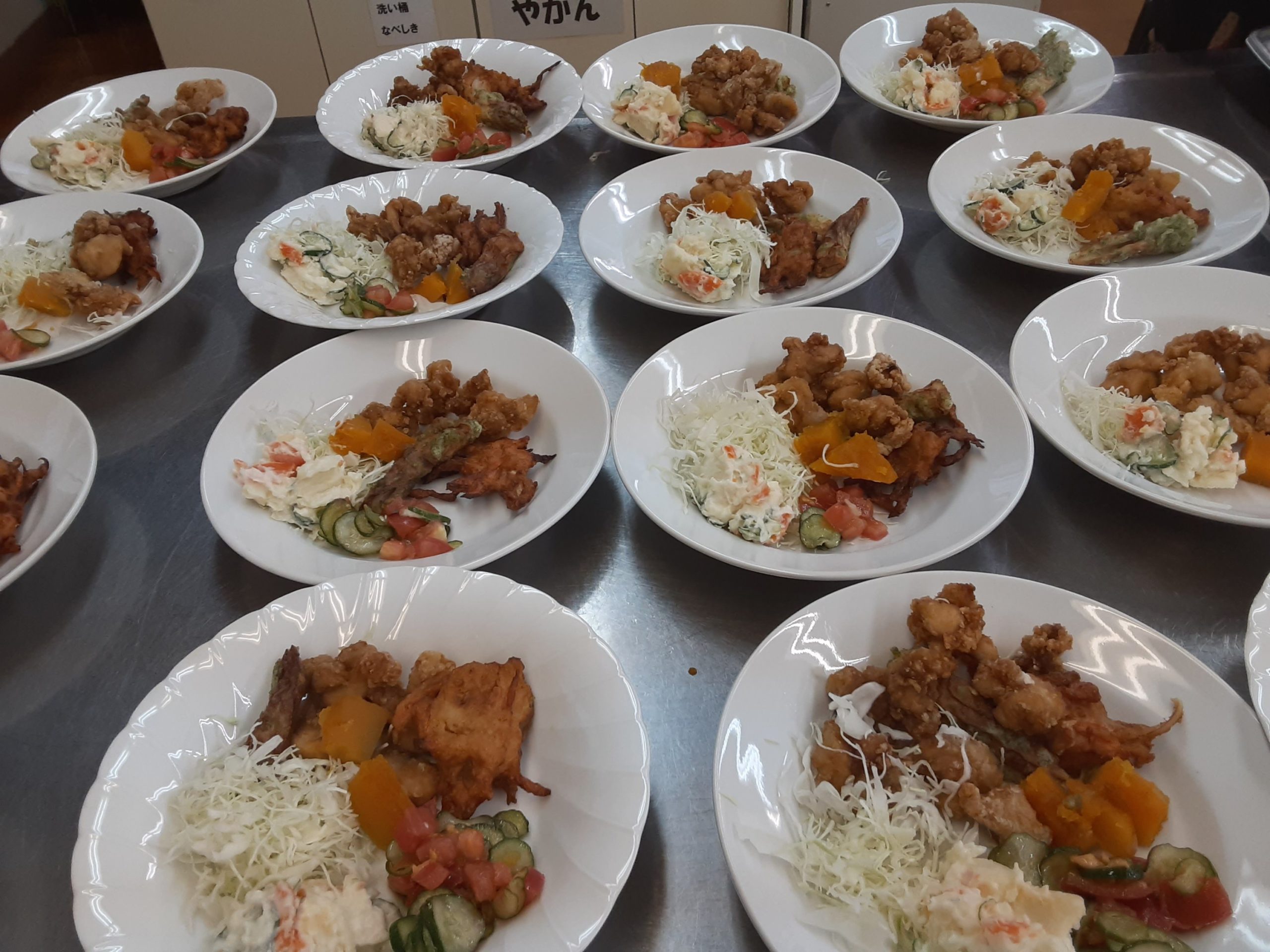 炊きたてのご飯(9合)に熱々のお味噌汁、そして主菜の唐揚げと野菜は知り合いのお店から。