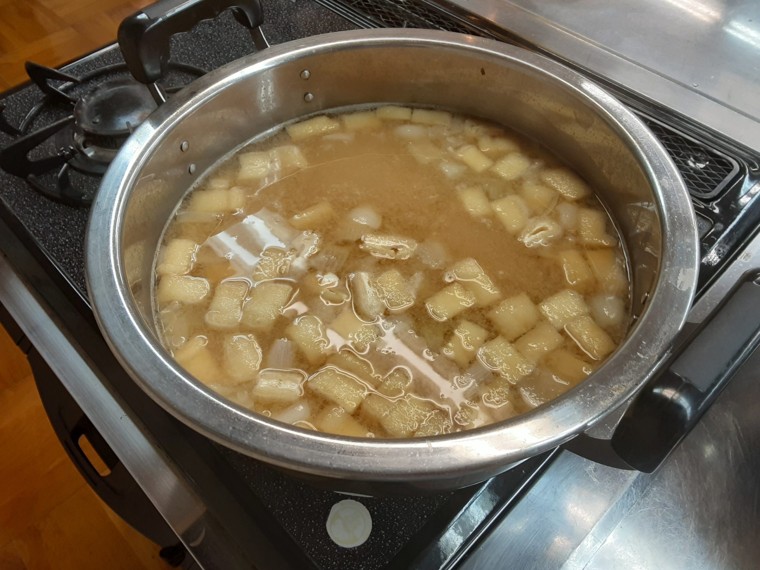 食器(お皿等5種類)の煮沸から用意を初めました。17人分を手際よく作業します。